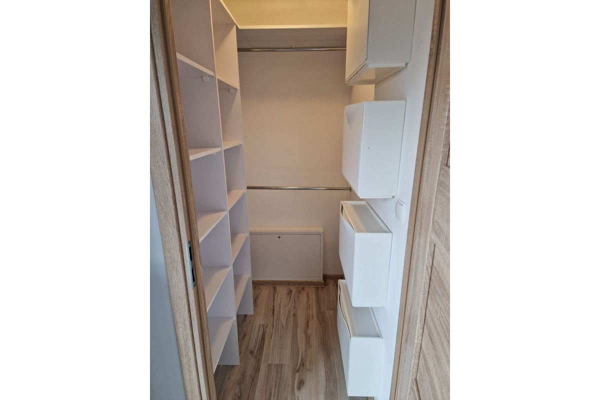 Garderoba Zabudowana szafa przy sypialni, podświetlenie LED i ergonomiczne podziały na ubrania i dodatki.
