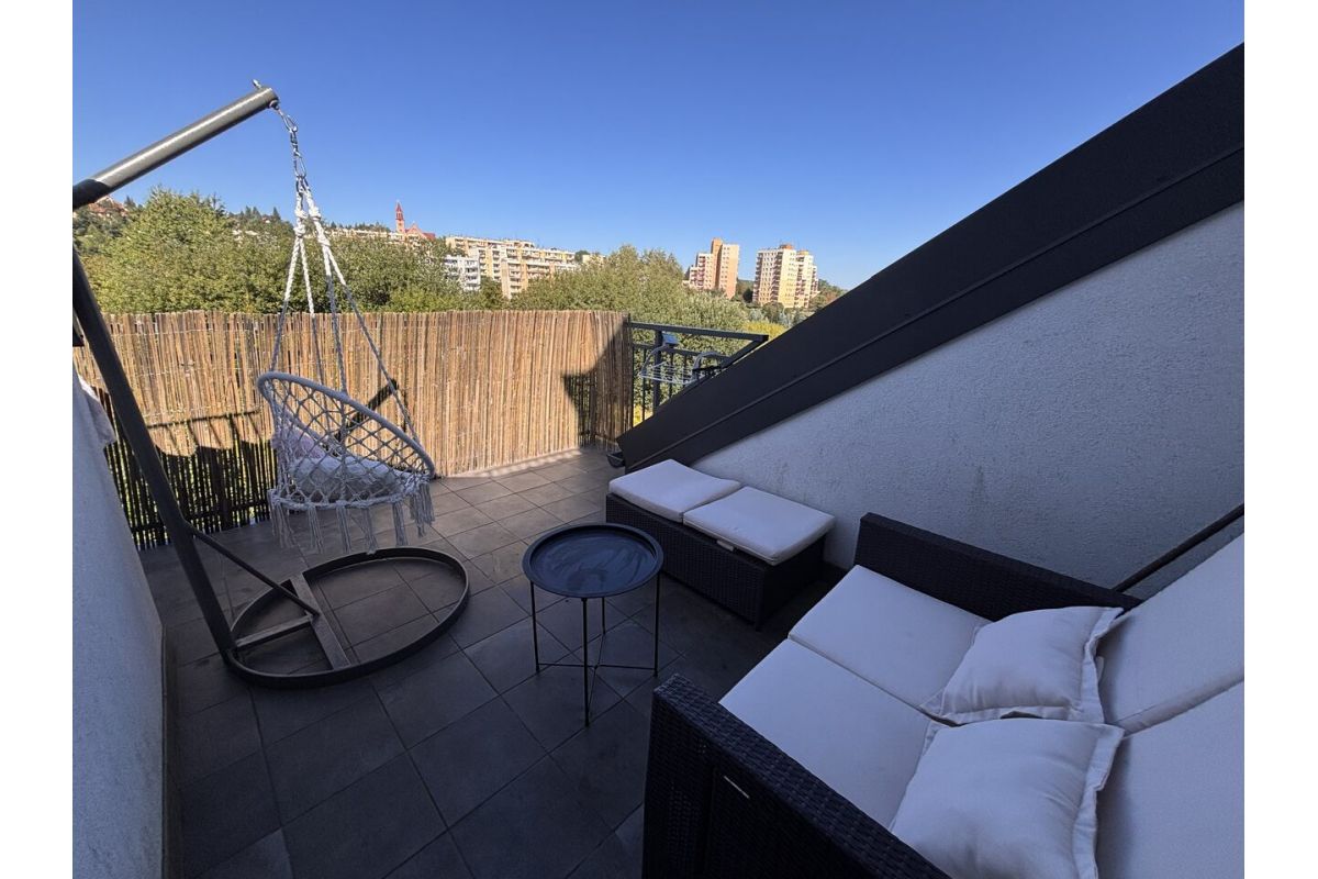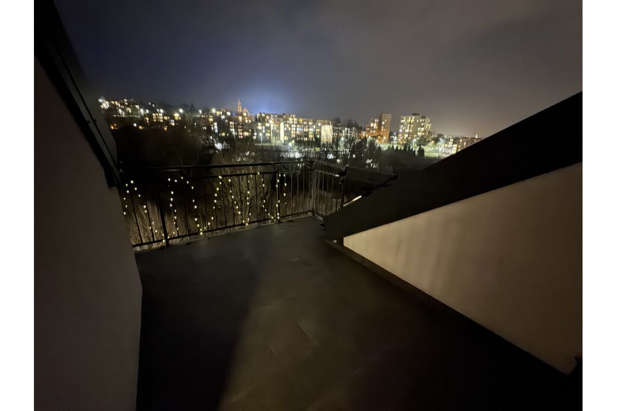 Taras bardzo duży spokojny taras z widokiem na zieleń i panoramę miasta.